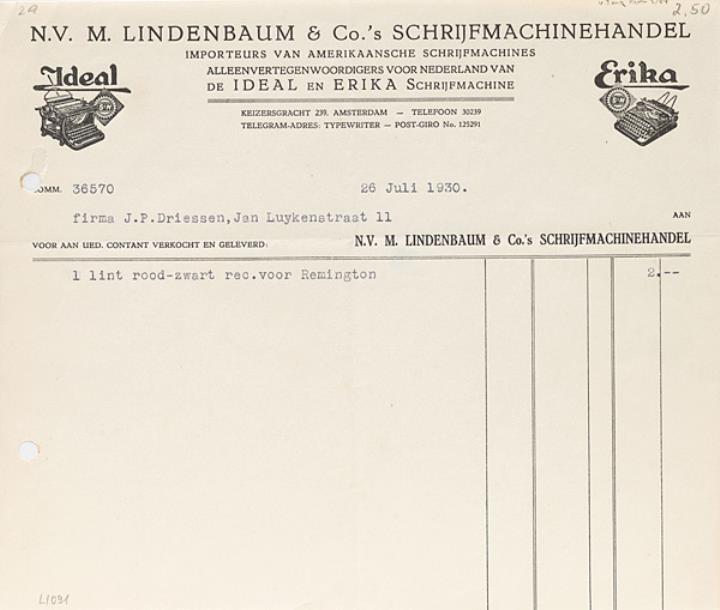 Rechnung Nr. 36570 der Schreibmaschinenhandlung N.V. M. Lindenbaum & Co.'s, Amsterdam adressiert an Firma J.P. Driessen; datiert 26.07.1930 Maschinenschrift