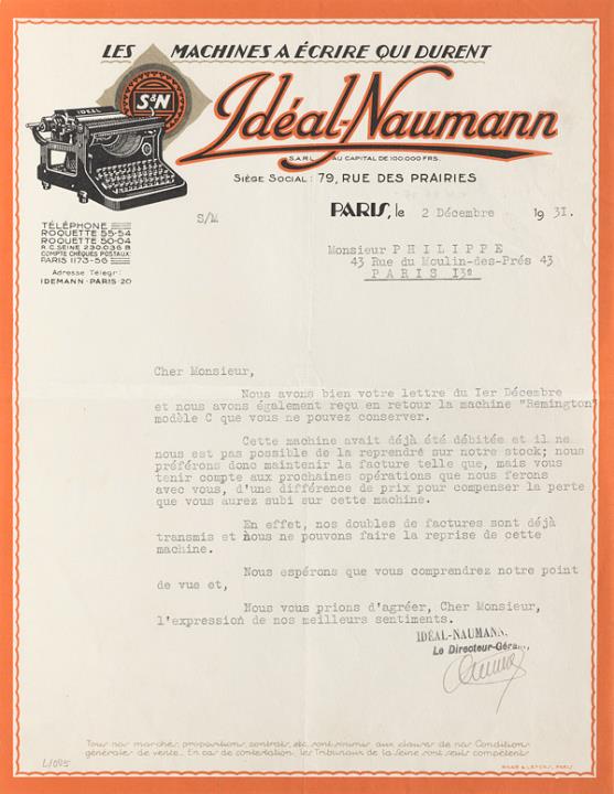 Brief der Ideal Naumann S.a.r.l., Paris adressiert an Monsieur Philippe, Paris; datiert 02.12.1931 Maschinenschrift, unterschrieben