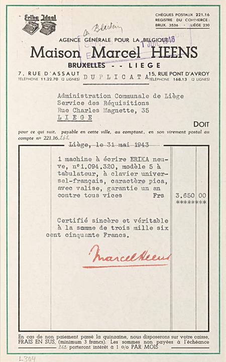 Rechnung der Schreibmaschinenhandlung Maison Marcel Heens, Liége adressiert an Administration Communale de Liége; datiert 31.05.1943 Maschinenschrift, unterschrieben