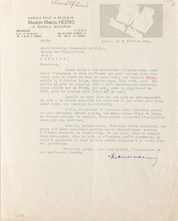 Brief der Schreibmaschinenhandlung Maison Marcel Heens, Liége adressiert an Administration Communale de Liége, Seraing; datiert 16.02.1944 Maschinenschrift, unterschrieben