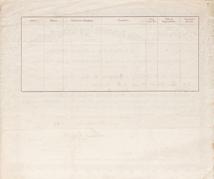 Aktie Nr. 19 der Granville Automatic Typewriter Syndicate Ltd. über 50 Anteile ausgestellt auf Wilfred Bevan; datiert 22.11.1899 Druck: Waterloo Bros. & Layton Ltd.