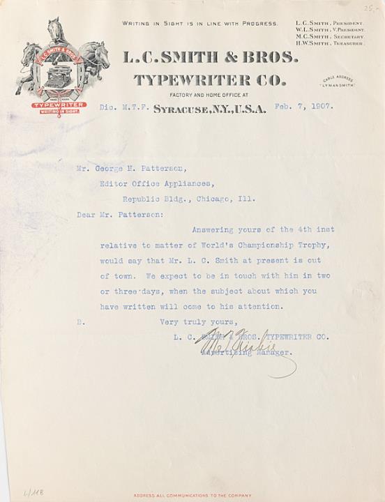Brief der L.C. Smith & Bros. Typewriter Co., Syracuse adressiert an Mr. Patterson, Chicago; datiert 07.02.1907 Maschinenschrift, unterschrieben