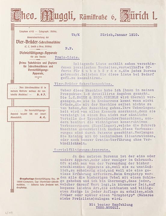 Werbebrief der Schreibmaschinenhandlung Theo. Muggli, Zürich; datiert Januar 1910 Maschinenschrift; Briefbogen mit Wasserzeichen "Excheque Bond"