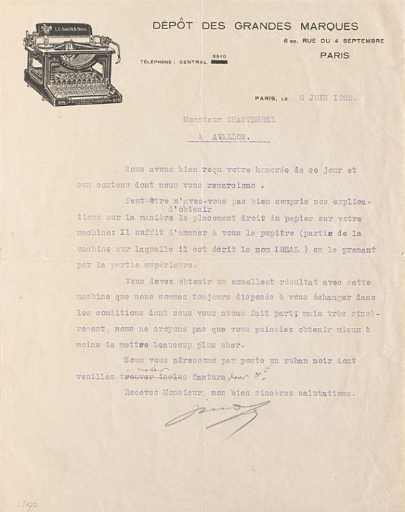 Brief der Schreibmaschinenhandlung Depot des Grandes Marques, Paris adressiert an Monsieur Chantegrel, Avallon; datiert 06.06.1922 Maschinenschrift, unterschrieben