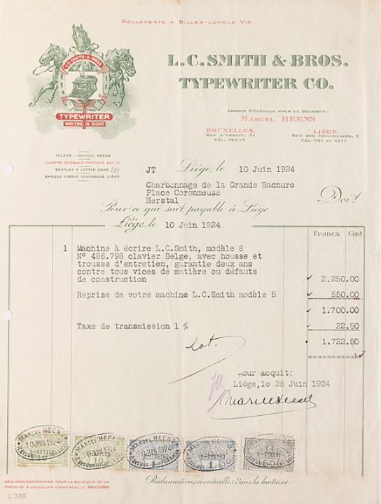 Rechnung der Schreibmaschinenhandlung Marcel Heens, Liége adressiert an Carbonnage de la Grande Bacnure, Herstal; datiert 10.06.1924 Maschinenschrift, unterschrieben; mit Gebührenmarken