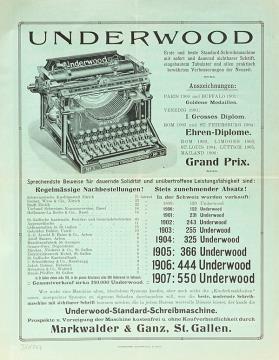 Faltprospekt der Schreibmaschinenhandlung Markwalder & Ganz, St. Gallen für Schreibmaschine Underwood 5 und Schreibmaschinenzubehör