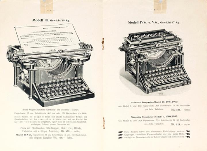 Prospekt für Schreibmaschine Underwood Modelle 1 - 5; mit Schriftarten und Tastaturenverzeichnis