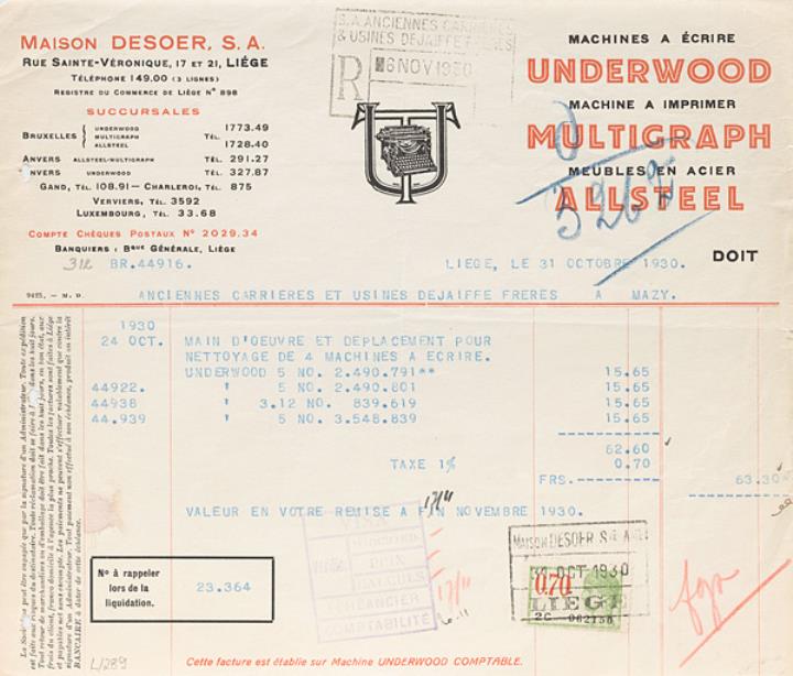 Rechnung Nr. 23.364 der Schreibmaschinenhandlung Maison Desoer, Liége adressiert an Anciennes Carrieres et Usines Dejaiffe Freres, Mazy; datiert 31.10.1930 Maschinenschrift, unterschrieben; mit Gebührenmarke