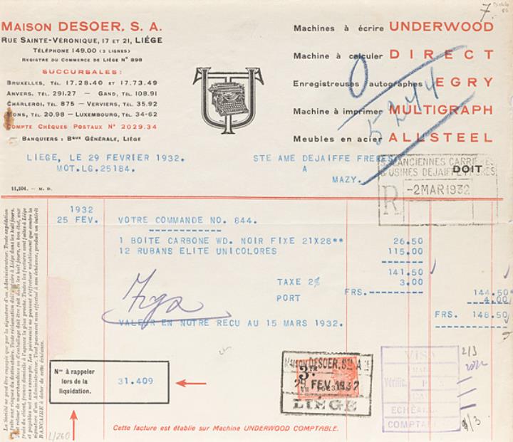 Rechnung Nr. 31.409 der Bürowarenhandlung Maison Desoer, Liége adressiert an Ste Ame Dejaiffe Freres, Mazy; datiert 29.02.1932 Maschinenschrift, unterschrieben; mit Gebührenmarke