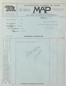 Lieferschein des Schreibmaschinenherstellers MAP, Paris adressiert an Monsieur Philippe, Paris; datiert 27.06.1933 Maschinenschrift