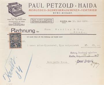 Rechnung der Schreibmaschinenhandlung Paul Petzold, Haida adressiert an Firma Wendler & Co; datiert 30.05.1922 Maschinenschrift, unterschrieben; mit Gebührenmarke