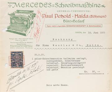 Rechnung der Schreibmaschinenhandlung Paul Petzold, Haida adressiert an Firma Wendler & Co; datiert 19.06.1923 Maschinenschrift, mit Gebührenmarke