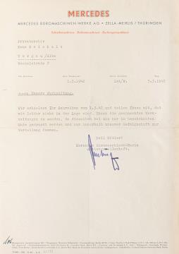 Brief der Mercedes Büromaschinenwerke, Zella-Mehlis adressiert an Privatarchiv Franz Reichelt, Torgau; datiert 05.03.1942 Maschinenschrift, unterschrieben