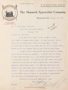 Brief der Monarch Typewriter Company, Syracuse adressiert an Geo. Patterson, Office Appliance Company, Chicago; datiert 31.01.1907 Maschinenschrift, unterschrieben; Briefbogen mit Wasserzeichen "Monarch Visible"