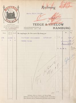 Rechnung Nr. 144 der Schreibmaschinenhandlung Teege & Stielow Hamburg adressiert an Herrn Rathens, Hamburg Maschinenschrift, Handschrift; Briefbogen mit Wasserzeichen "Waymark"