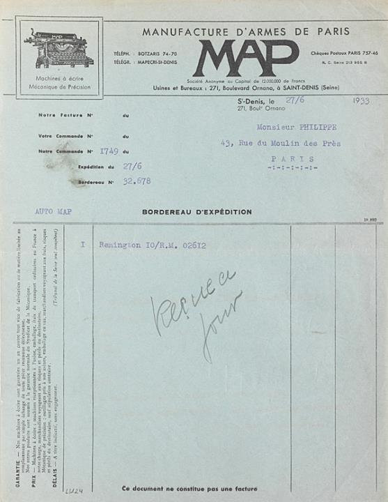 Lieferschein des Schreibmaschinenherstellers MAP, Paris adressiert an Monsieur Philippe, Paris; datiert 27.06.1933 Maschinenschrift