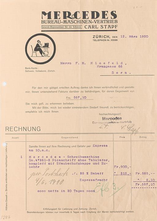 Rechnung der Schreibmaschinenhandlung Carl Stapf, Zürich adressiert an Herrn Kleefeld, Bern; datiert 12.03.1920 Maschinenschrift, unterschrieben
