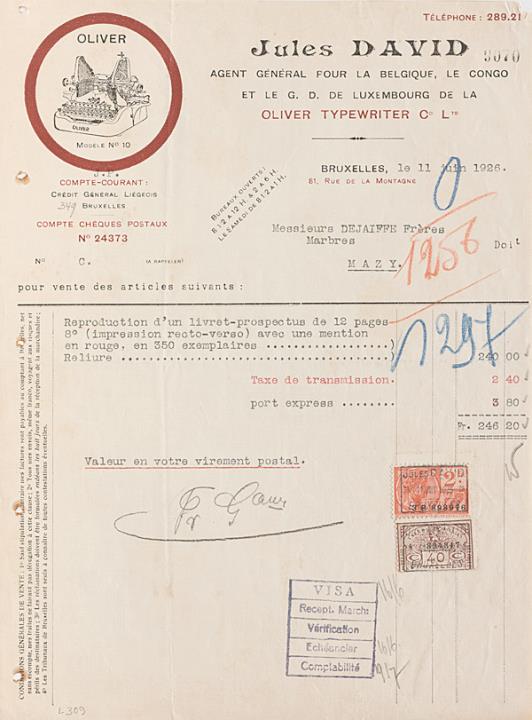 Rechnung der Schreibmaschinenhandlung Jules David, Brüssel adressiert an Messieurs Dejaiffe Frères, Mazy; datiert 11.06.1926 Maschinenschrift, unterschrieben; mit Gebührenmarken