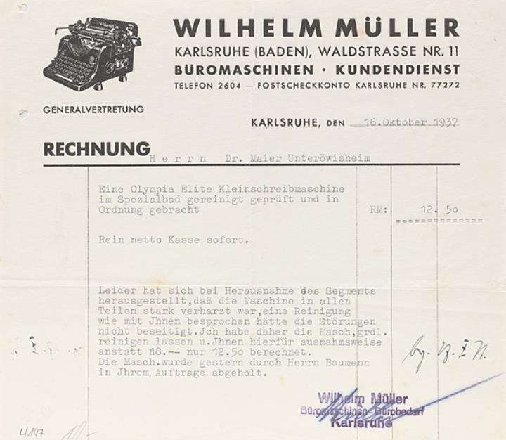 Rechnung der Schreibmaschinenhandlung Wilhelm Müller, Karlsruhe adressiert an Herrn Maier, Unteröwisheim; datiert 16.10.1937 Maschinenschrift, unterschrieben