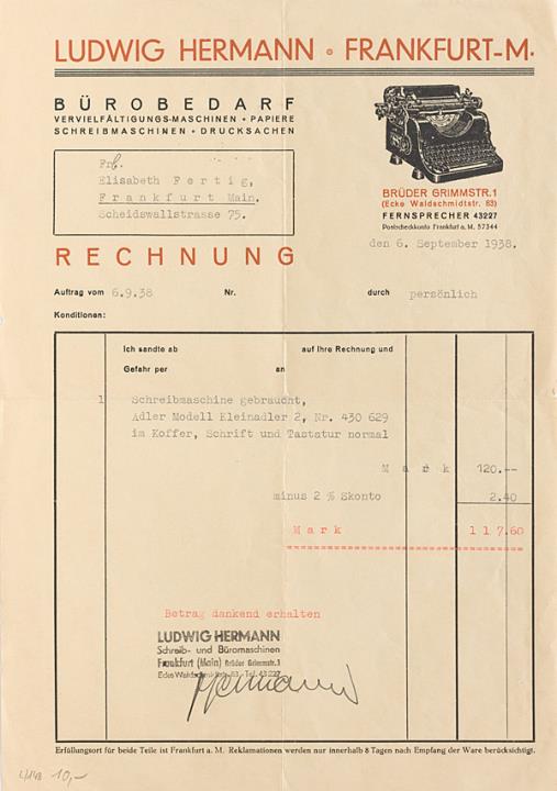 Rechnung der Bürowarenhandlung Ludwig Hermann, Frankfurt adressiert an Frl. Fertig, Frankfurt; datiert 06.09.1938 Maschinenschrift, unterschrieben