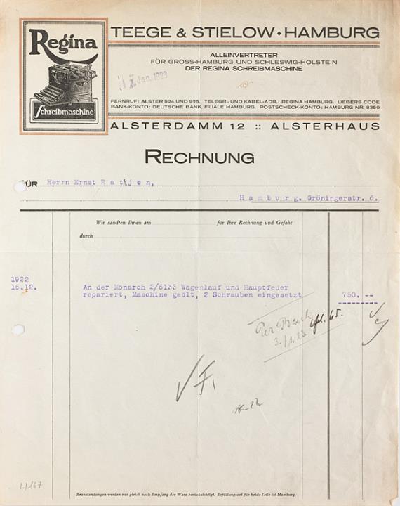 Rechnung der Schreibmaschinenhandlung Teege & Stielow, Hamburg adressiert an Herrn Rathjen, Hamburg; datiert 16.12.1922 Maschinenschrift, Briefbogen mit Wasserzeichen "SVPapier"