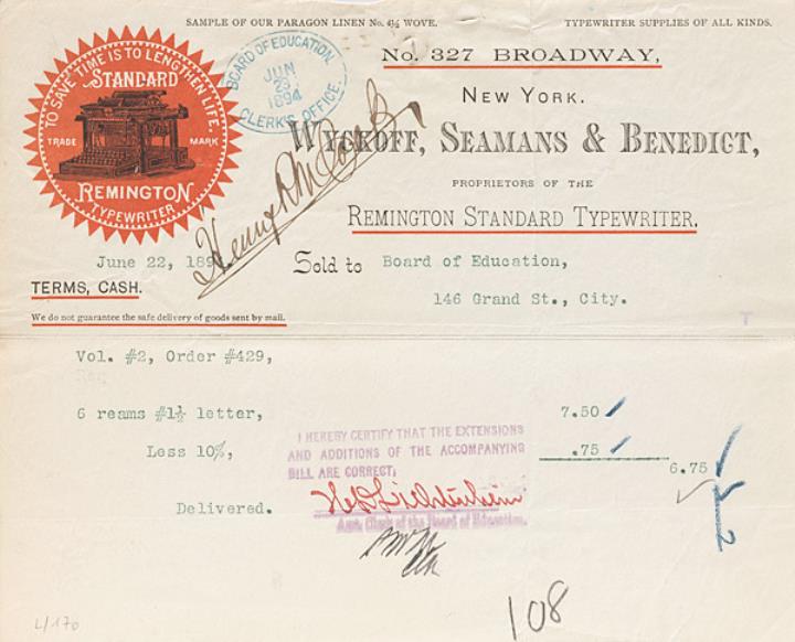 Rechnung der Firma Wyckoff, Seamans & Benedict, New York adressiert an Board of Education, New York; datiert 22.06.1894 Maschinenschrift, unterschrieben
