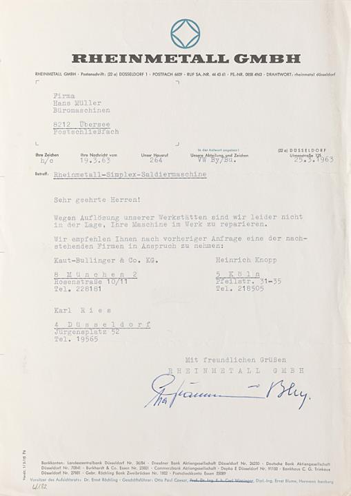 Brief der Rheinmetall GmbH, Düsseldorf adressiert an Firma Müller Büromaschinen, Übersee; datiert 25.03.1963 Maschinenschrift, unterschrieben; Briefbogen mit Wasserzeichen "Zeta"