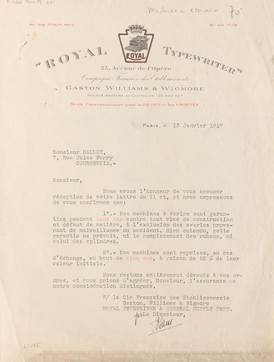 Brief der Royal Typewriter Compagnie, Paris adressiert an Monsieur Ballet, Courbevoie; datiert 13.01.1917 Maschinenschrift, unterschrieben; Briefbogen mit Wasserzeichen "extra strong"