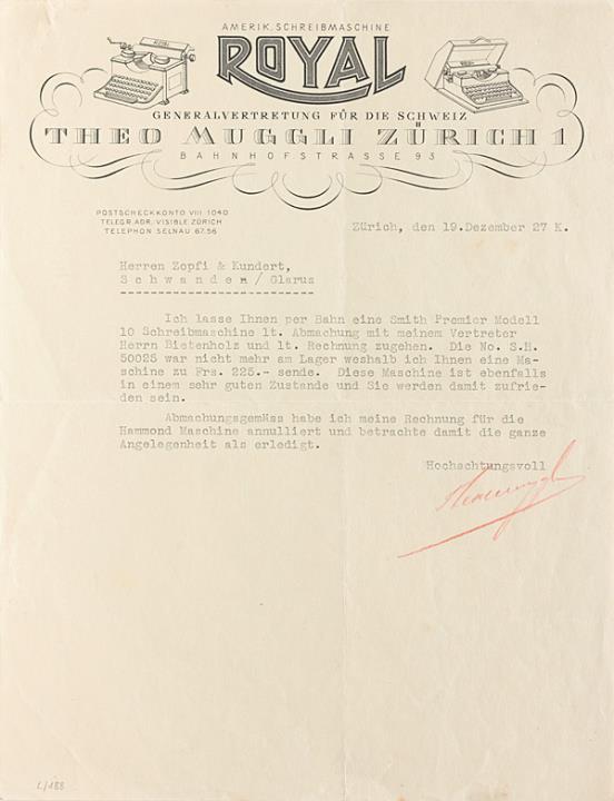 Brief der Schreibmaschinenhandlung Theo. Muggli, Zürich adressiert an Herren Zopfi & Kundert, Schwanden; datiert 19.12.1927 Maschinenschrift, unterschrieben; Briefbogen mit Wasserzeichen "Japon Torpes"