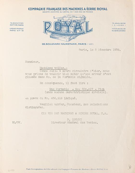 Rundschreiben der Royal S. A., Paris; datiert 05.12.1936 Maschinenschrift, Briefbogen mit Wasserzeichen