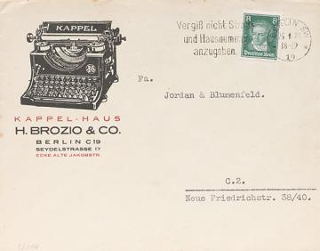 Briefumschlag mit Firmendruck der Schreibmaschinenhandlung H. Brozio & Co. adressiert (Maschinenschrift) an Fa. Jordan & Blumenfeld; Briefmarke Deutsches Reich 8 Pf.; Poststempel Berlin