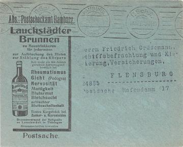 Postscheckumschlag mit beidseitigem Werbedruck adressiert an Herr Grüsemann, Flensburg; Poststempel Hamburg