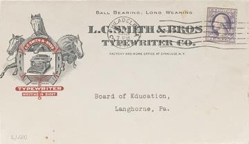 Briefumschlag der L. C. Smith Typewriter Co., Syracuse adressiert (Maschinenschrift) an Board of Education, Langhorne; Briefmarke U.S. Postage 3 Cents; Poststempel Philadelphia/May xx 1919