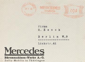 Vorderseite eines Briefumschlags mit Firmendruck und Absenderfreistempel der Mercedes Büromaschinenwerke, Zella-Mehlis adressiert (Maschinenschrift) an Firma Zeeck, Berlin Stempel: Zella-Mehlis/21.1.33, Werbung Mercedes Deutsche Büromaschine, Wert Deutsches Reich 4 RPf.