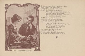 Illustrierte Postkarte; Grafik, monochrom Rückseite: Vorgesetzter und Sekretärin mit Schreibmaschine, Darstellung umrahmt; daneben romantischer Text in Versform Vorderseite: beschrieben; adressiert an Fräulein Schumann