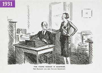 Illustrierte Postkarte; Grafik, monochrom Serie "Funny Girls Cartooning for Equality"; copyright Wallis Mills (1931) Rückseite: Vorgesetzte und Sekretär mit Schreibmaschine, weiterer Text: The Manager and her Private Secretary Vorderseite nicht beschrieben