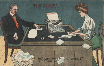 Illustrierte Postkarte; Grafik, polychrom Rückseite: Vorgesetzter und Sekretärin mit Schreibmaschine, Kartusche mit Text in Versform Vorderseite: beschrieben; adressiert an Miss Ludke, Portland; Briefmarke U.S. Postage One Cent; Poststempel Walla Walla/Oct 16 1909