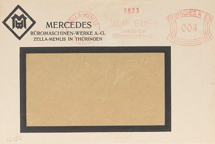 Briefumschlag mit Firmendruck und Absenderfreistempel der Mercedes Büromaschinenwerke, Zella-Mehlis Stempel: 27.11.33, Werbung Mercedes Deutsche Büromaschine, Wert Deutsches Reich 4 RPf.