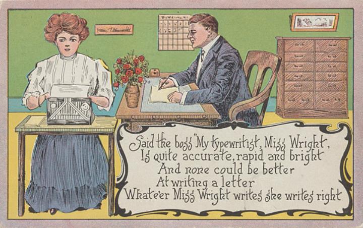 Illustrierte Postkarte; Grafik, polychrom Rückseite: Vorgesetzter und Sekretärin mit Schreibmaschine, Kartusche mit Text in Versform Vorderseite: beschrieben; adressiert an Miss Ludke, Portland; Briefmarke U.S. Postage One Cent; Poststempel Walla Walla/Oct 16 1909