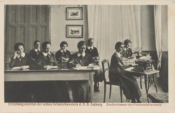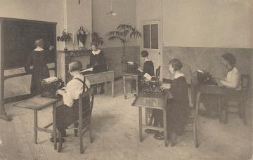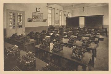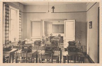 Illustrierte Postkarte; Fotografie, monochrom Rückseite: Unterrichtsraum mit Schülerinnen beim Maschinenschreiben Vorderseite mit Beschreibungstext: Institution des Soeurs de la Ste Famille à Ypres [...] Steno-Dactylo; nicht beschrieben