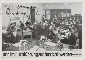 Illustrierte Postkarte; Fotografie, monochrom Rückseite: Unterrichtsraum mit Schülerinnen und Schreibmaschinen Vorderseite nicht beschrieben