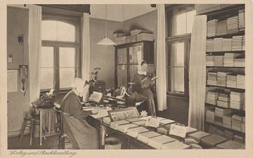 Illustrierte Postkarte; Fotografie, monochrom; Nr. 11288 Rückseite: Raum/Büroansicht; zwei Ordensfrauen im Habit, Tisch mit Schreibmaschine Vorderseite mit Beschreibungstext: Diakonissen-Mutterhaus Hensoltshöhe Gunzenhausen (Bayern); nicht beschrieben