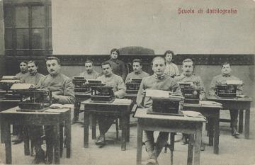 Illustrierte Postkarte; Fotografie, monochrom; Nr. 3296 Rückseite: Unterrichtsraum; zwei Lehrerinnen stehend und Männer in Uniform beim Maschinenschreiben Vorderseite mit Beschreibungstext: casa di rieducazione professionale per mutilati di guerra Bologna (Umschulungsanstalt für Kriegsversehrte); nicht beschrieben