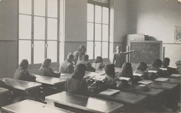 Illustrierte Postkarte; Fotografie, monochrom Rückseite: Unterrichtsraum mit Schülerinnen und Schreibmaschinen Vorderseite nicht beschrieben
