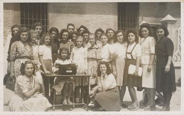 Illustrierte Postkarte; Fotografie, monochrom Rückseite: Aufnahme im Freien; junge Frauen in Sommerkleidern posieren für ein Gruppenbild, in der Mitte ein Tisch mit Schreibmaschine Everest Vorderseite nicht beschrieben