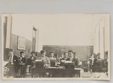 Illustrierte Postkarte (Echtfoto), mit einer Fotografie überklebt; monochrom Fotografie: Unterrichtsraum mit jungen Männern beim Maschinenschreiben Postkarte: Landschaft mit Häuserdächern / Vorderseite nicht beschrieben
