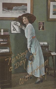 Illustrierte Postkarte; Fotografie, Grafik, polychrom Rückseite: Büroansicht; Frau/Sekretärin mit Schreibmaschine, Kartusche mit Text Vorderseite: beschrieben, adressiert an Miss Snyder, Osage; Briefmarke U.S. Postage One Cent; Poststempel Osage/Dec 2 1910