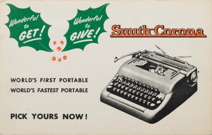 Werbepostkarte; Grafik, polychrom Rückseite: Schreibmaschine Smith-Corona Vorderseite: Werbetext; nicht beschrieben