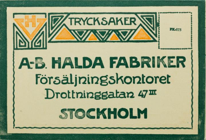 Antwortpostkarte; Grafik, polychrom Werbekarte: adressiert an Tekniska Högskolans Studentkar, Stockholm; Briefmarke Sverige 5 Öre; Poststempel Stockholm/20.8.1920.6-7 / Werbetext Antwortkarte: vorgedruckter Bestelltext / vorgedruckte Anschrift A.B. Halda Fabriker, Stockholm