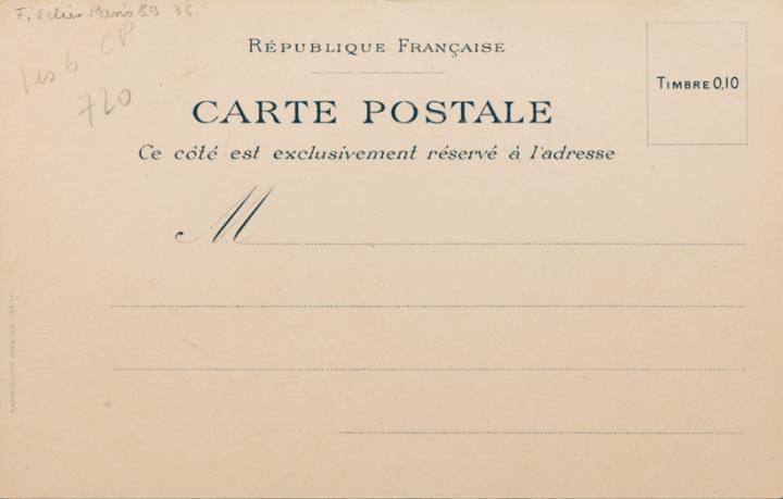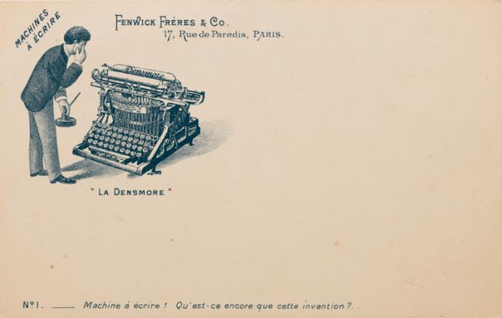 Werbepostkarte einer Serie; Grafik, monochrom; Rückseite: Mann/Sekretär mit Schreibmaschine Densmore; Text Nr. 1: Machine à ècrire! [...] Vorderseite nicht beschrieben
